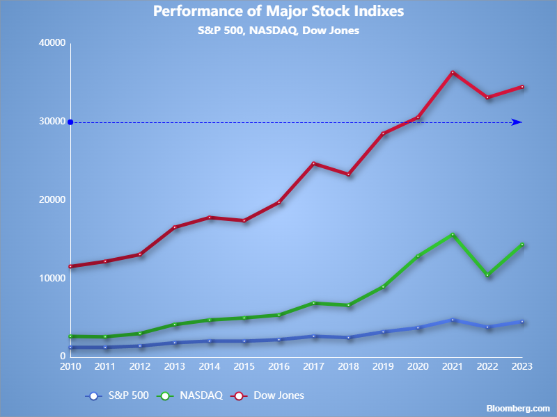 The performance of major stock indices from 2010 to 2023. The line graph displays the major US indices.