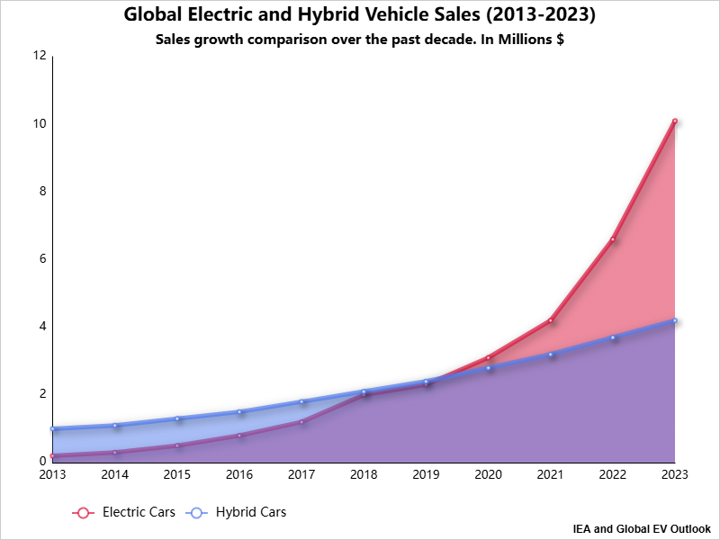 Sales in electric and hybrid vehicle sales from 2013 to 2023. This area chart highlights the expanding market.